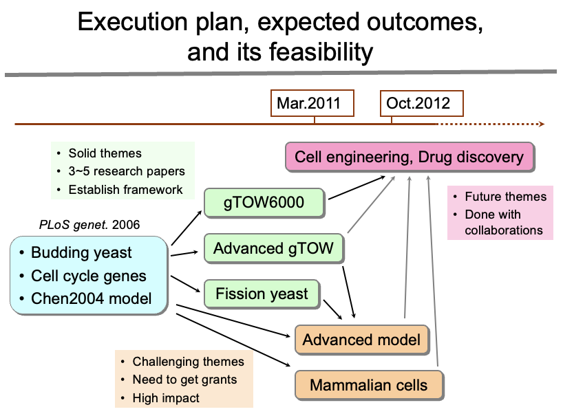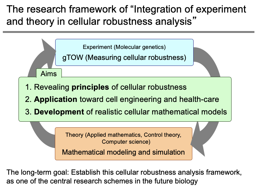 細胞周期システム中に見られる脆弱性のメカニズム、潜在的な脆弱性を回避してロバストネスを作るメカニズムを、出芽酵母と分裂酵母それぞれで数理モデルとgTOW実験で示した論文(Kaizu PLoS Genet. 2010、Moriya Mol. Syst. Biol. 2011)が代表的なもの。ちなみに、これらの執筆の苦労話(?)についても、当時のブログをまとめたものが残っている。