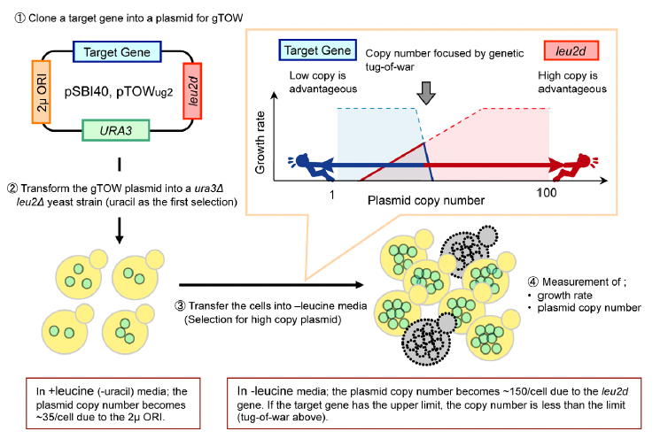 分裂酵母のgTOW(pombe-gTOW)を始めるきっかけは、沖縄大学院大学(OIST)の前身プロジェクトのシンポジウムで、分裂酵母の大御所のY先生が守屋の出芽酵母のgTOW実験の結果を見て、「分裂酵母だとこうはならない」、と言ったことだった。「それならば分裂酵母で試してやろうじゃないか」、ということで分裂酵母をはじめてみた。出芽酵母と同じく酵母とは言えやはりそれなりに勝手が違い、それなりに扱いが難しい。だが、この時、分裂酵母のgTOWの系を作ったおかげで、真核細胞に共通する原理を調べることができるようになった。分裂酵母のgTOWは、バックボーンのプラスミドづくりからしっかり作った。かなり良くできた系。