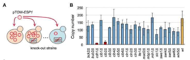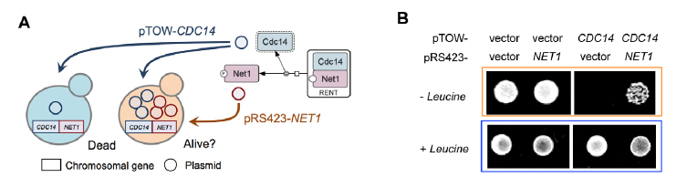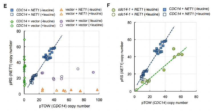 次に、二次元のgTOW(2D-gTOW)というのを行った。2D-gTOWでは2種類の多コピープラスミドを酵母に導入して、それらのコピー数の関係性からプラスミドに組み込まれている遺伝子間の相互作用をみるというもので、CDC14とNET1の量的均衡をうまく検出するのに成功した。
