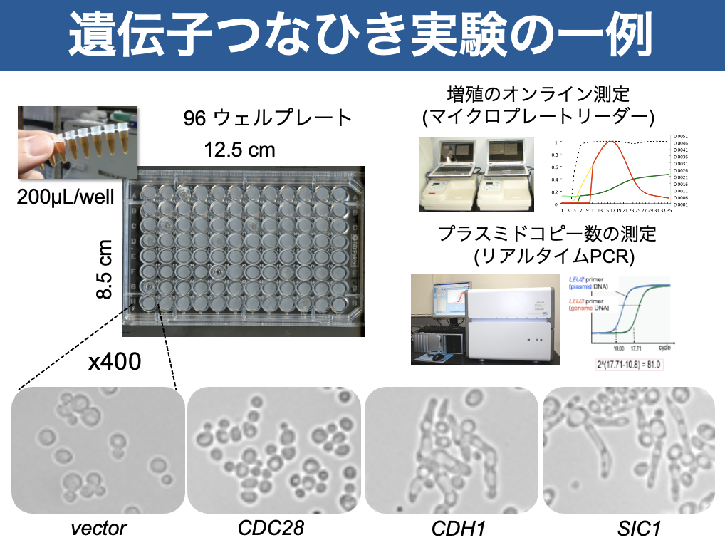 ここで少し本題とは違う事を書いておく。守屋はいわゆる酵母の分子遺伝学をやった後、北野プロジェクト→さきがけ→異分野コアという、異分野融合の領域で研究をやってきた。そうすると、酵母の分子遺伝学者が「常識」だと思っていたことが、全然常識じゃないことを知る。それは特にプレゼンテーションの時に重要で、さらっと話しても伝わらないことも多い。同時に、業界人にとって当たり前になっている酵母の分子遺伝学だけが持つすごいパワーも知ることになる。聴衆がどれくらいの背景知識を持っているのか、何を聞いたら驚くのかなどが想像できるのを、「メタ認知能力」と守屋は呼んでいる。これはいろんなところで場数を踏んでいくことで身につく。上記の守屋のキャリアはそういうことを鍛える良い場だったと思う。というわけで、業界外に伝わるように作った2つのスライドを載せておく。