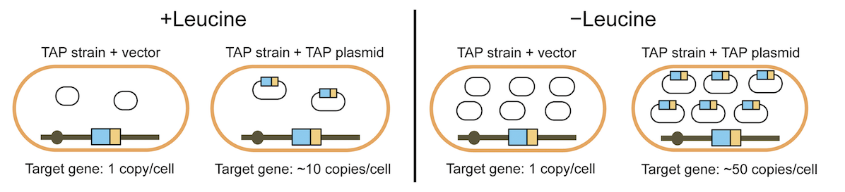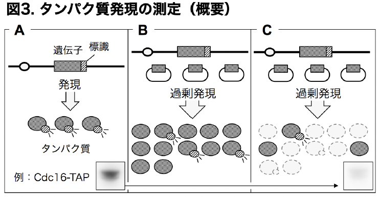 この実験手法の特徴は、遺伝子のコピー数を上げて(核におさめられた情報を過剰にして)、細胞システムの特定の要素を過剰にドライブさせる(機能としての蛋白質の量を過剰にする)ことにある。この実験で問題となることは、「遺伝子が1コピー増えるごとに蛋白質の発現量がそれに伴って2倍3倍・・・と直線的に増えていくとは限らない」という事である。これは、この実験系の「弱点」であるが、本研究ではこの弱点を利用する。すなわち、もし遺伝子のコピー数と蛋白質の発現量の間に相関がないのであれば、核の情報の揺らぎが蛋白質の発現量に影響を与えないようにする何らかの機構が隠されていることを示している。その機構として想定される、最もシンプルな例は、フィードバックである。ネガティブなフィードバックが組み込まれていれば、遺伝子コピー数の増加が、そのまま蛋白質の量の増加に伝わるのを防ぐだろう。