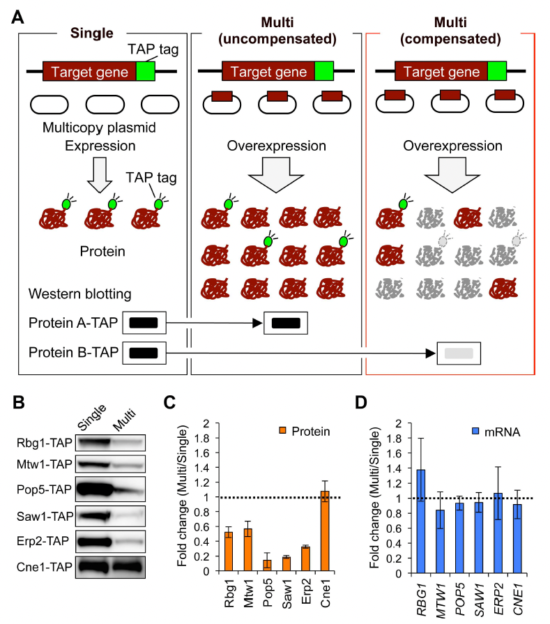 コピー数が増えているのにタンパク質量が増えないという現象は、遺伝子量補償(Gene dosage compensation)と呼ばれる。有名なのはヒトの性染色体で、女性の場合は2コピーあるため片方のX染色体が不活性化する。酵母でも体系的に調べられたことがあり、量補償は一般的ではなく、私たちの結果と同様に数%でのみ量補償が起きるという論文がある(Springer Mol. Syst. Biol. 2010)。