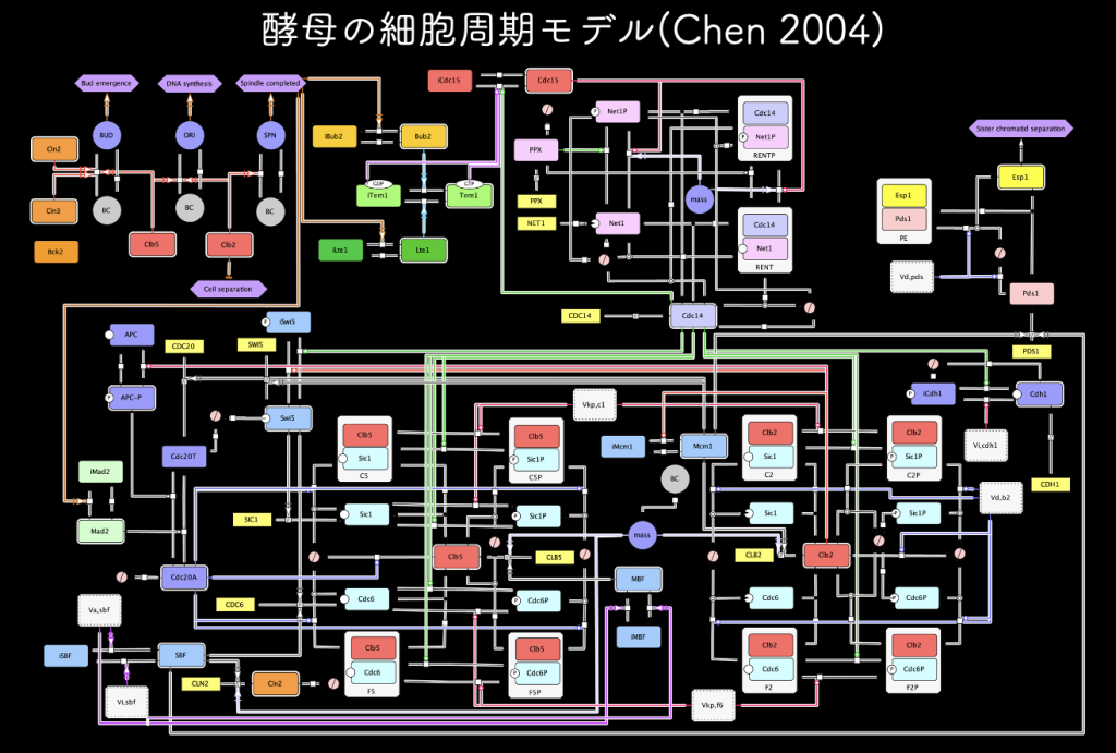 まず、細胞周期の数理モデル、守屋が愛した(?)Chen 2004モデルである(Chen MBoC 2004)。第1部:ロバストネス解析としてのgTOWーはじまりから完成まででも書いたが、このモデルは守屋がちょうど「システムバイオロジー」を始めたときに発表されて、これを写経するかのごとく分解することで、数理モデリングを学んだ。自分のブログにも、CellDesignerでこのモデルを再構築するエントリーシリーズを投稿している。この時作ったモデル図はパネルにして貼ってもいる。守屋はとてもカッコいいと思っているのだが、誰にも響いていないようだ。