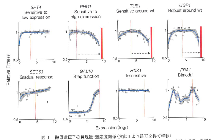 それで得られるものが、発現量ー適応度関係というグラフ(上図)。このグラフを見た瞬間、「あ、これって守屋がロバストネス解析で示したかったことじゃん!」と思った。それと同時に、「このデータはgTOWを説明するのにすごく良いぞ」と思った。つまり、gTOWでは適応度が下がる一番高いときの発現量を体系的に調べることができる。図の赤い線だ。「こういうことをやりたいんです」というプレゼンにすごく使えるフィギアとなった。だから上記の生体と科学の2018年の解説でも使っている。