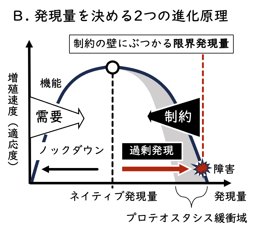 このエントリーで何が言いたいかというと、やっと時代が追いついたかということ。守屋は2006年にすでにそのコンセプトの実験をやってたんだぞ、と。ただ、残念ながら引用もされていないし、みんなその価値に気づいてくれなかった。守屋の実力が足りないんです。そうなんです。ではあるが、守屋自身もこの研究によって気づかされたことも多く、最近よく使っている発現量を決める2つの進化原理のモデル図(下図)も、この研究にインスパイアされたものである。