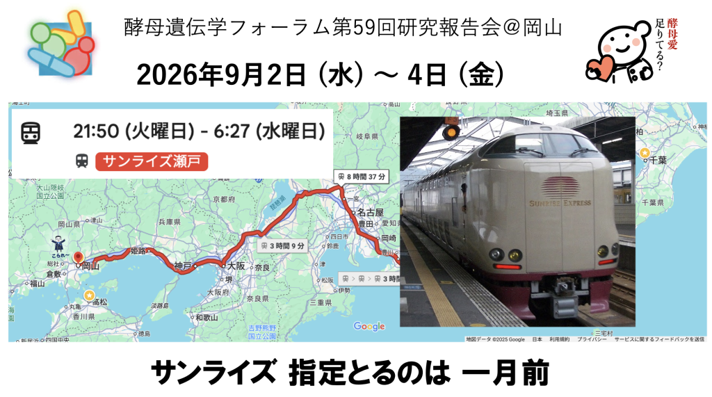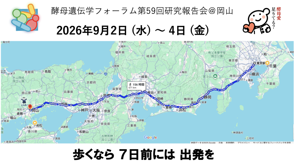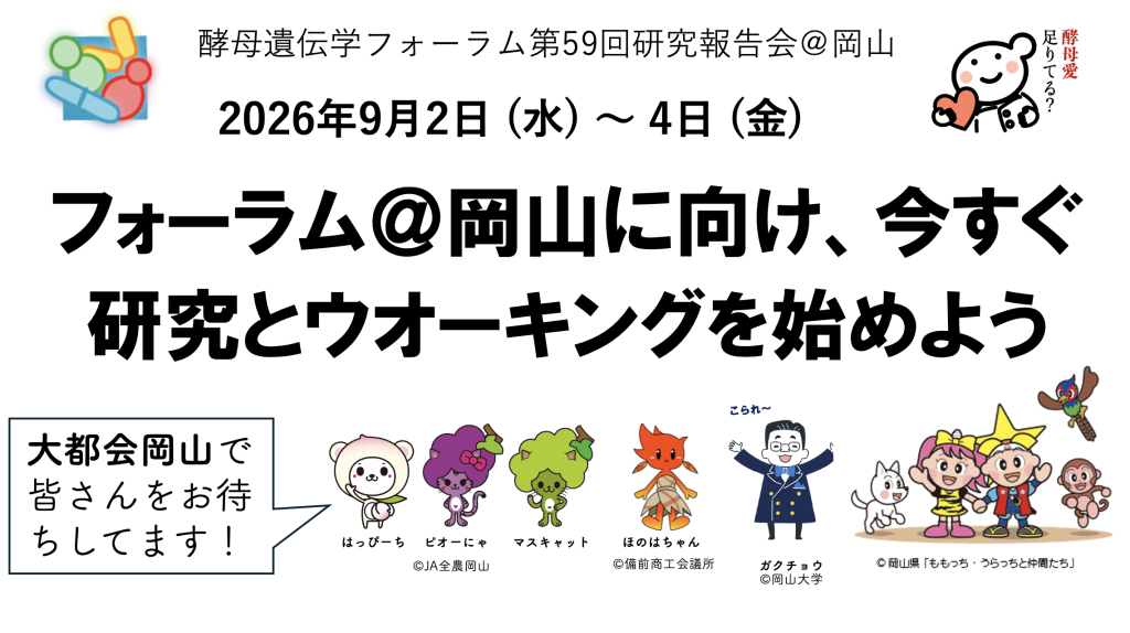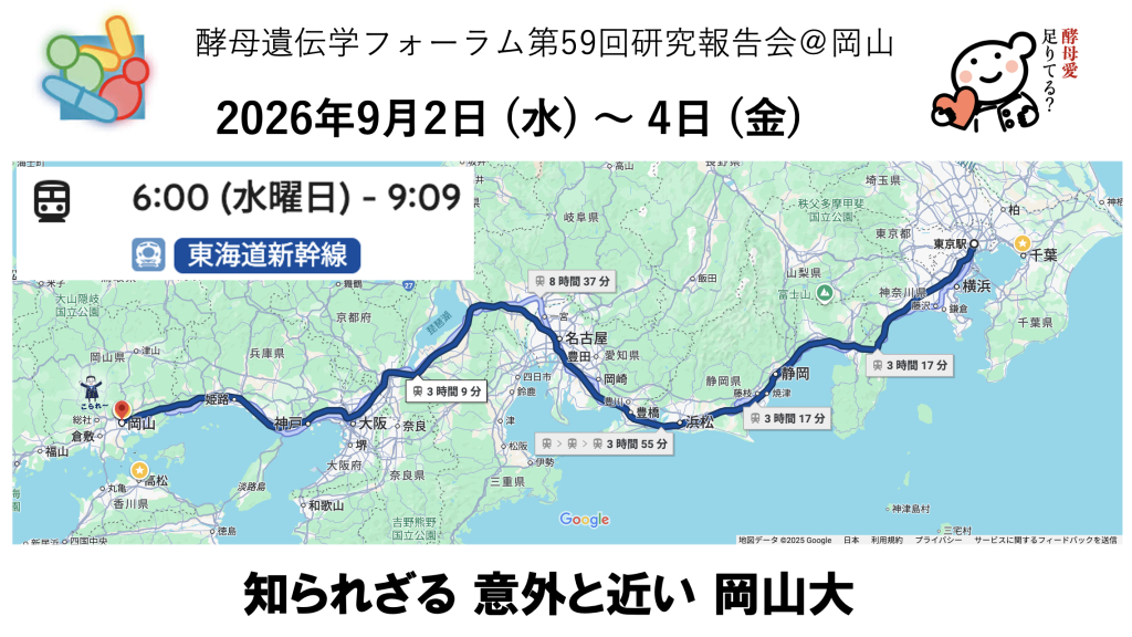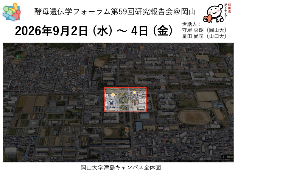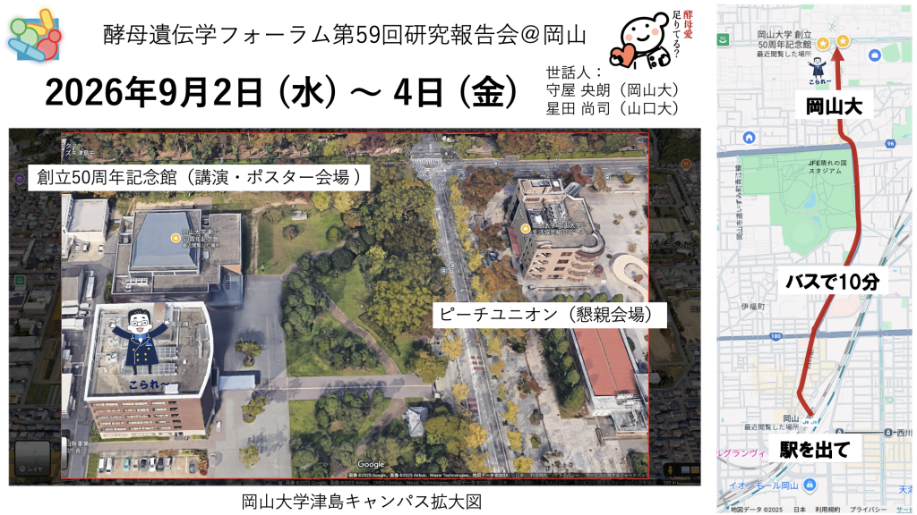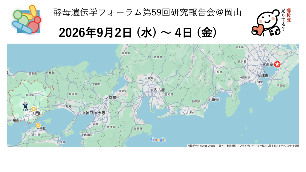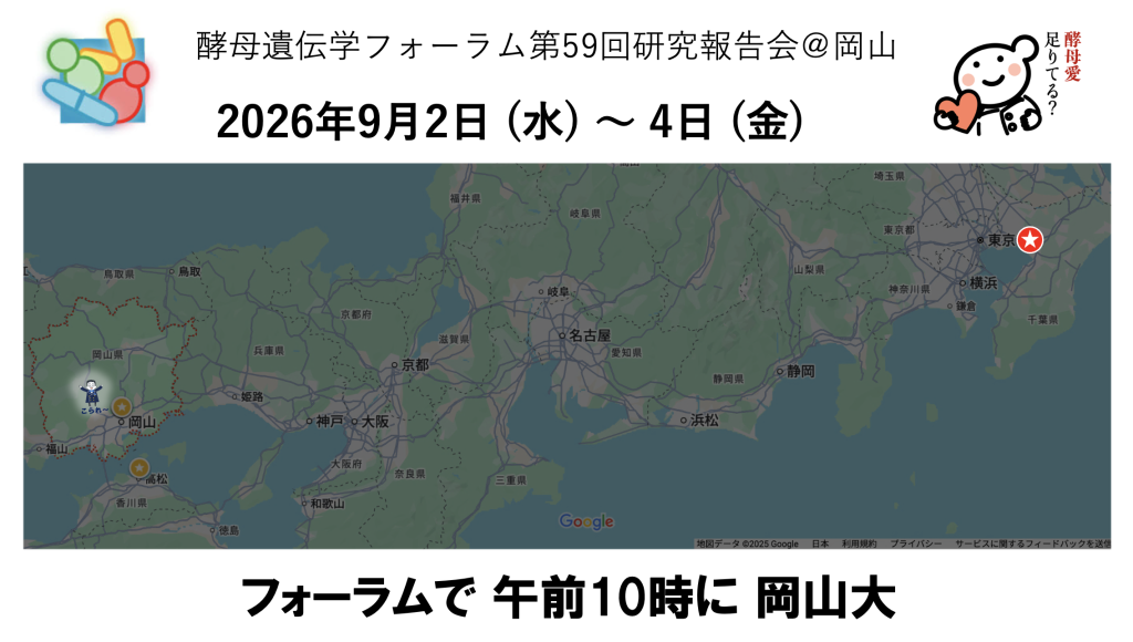 私に、「次々回(第59回)の研究報告会をやってもらえないか?」を打診されたのは、現在の酵母遺伝学フォーラム(以降、「フォーラム」)の会長の木村洋子先生でした。・・・というか、開催地を決める事が会長の最も大事な仕事なんだとか。打診されたのは今からほぼ1年前の高松での研究報告会の時でした。