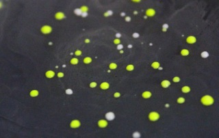 ところで、この酵母に「思いっきりGFPを作らせる」実験を行なうと、酵母の作るコロニー(細胞集団)自体が蛍光緑になります。とっても奇麗だと思いませんか?