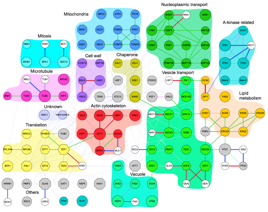 上記の解析でだいたいDSGの特長というのは分かりました。しかし私は何となく数字を扱うだけのボワっとした理解では納得がいかなかったので、これまでに分かっているDSG遺伝子/タンパク質の機能とそれらのつながりについて、目で見える形にしたいと思いました。それと同時に、DSGの遺伝子それぞれについて遺伝子データベースをながめて、自分の頭の中でそれらの持つ特徴について仮説を作れないかと考えました。ちなみに出芽酵母(Saccharomyces cerevisiae)は、Saccharomyces Genome Database(SGD)という、非常に優れたゲノム(遺伝子の総体のことを意味する)のデータベースが存在しています。